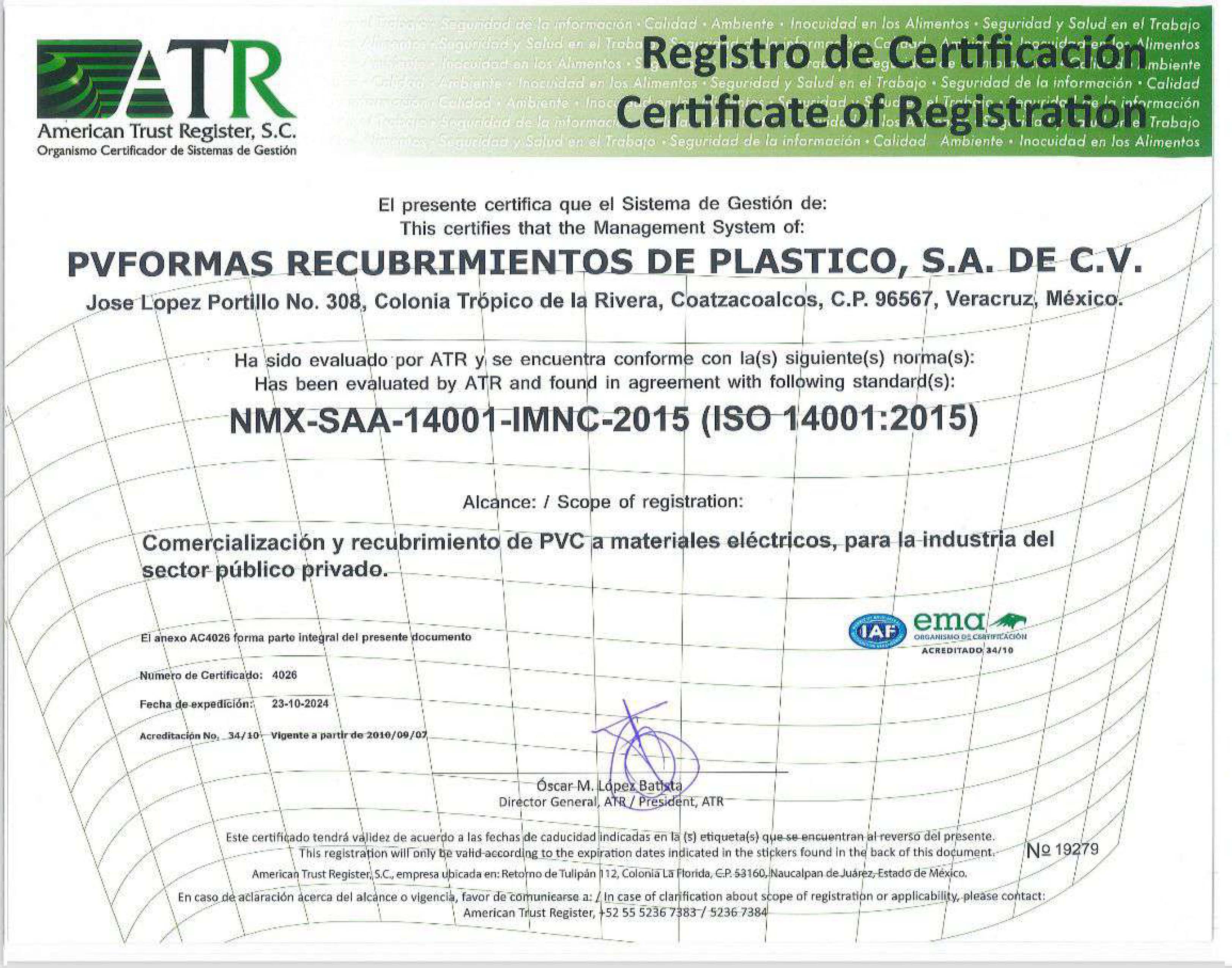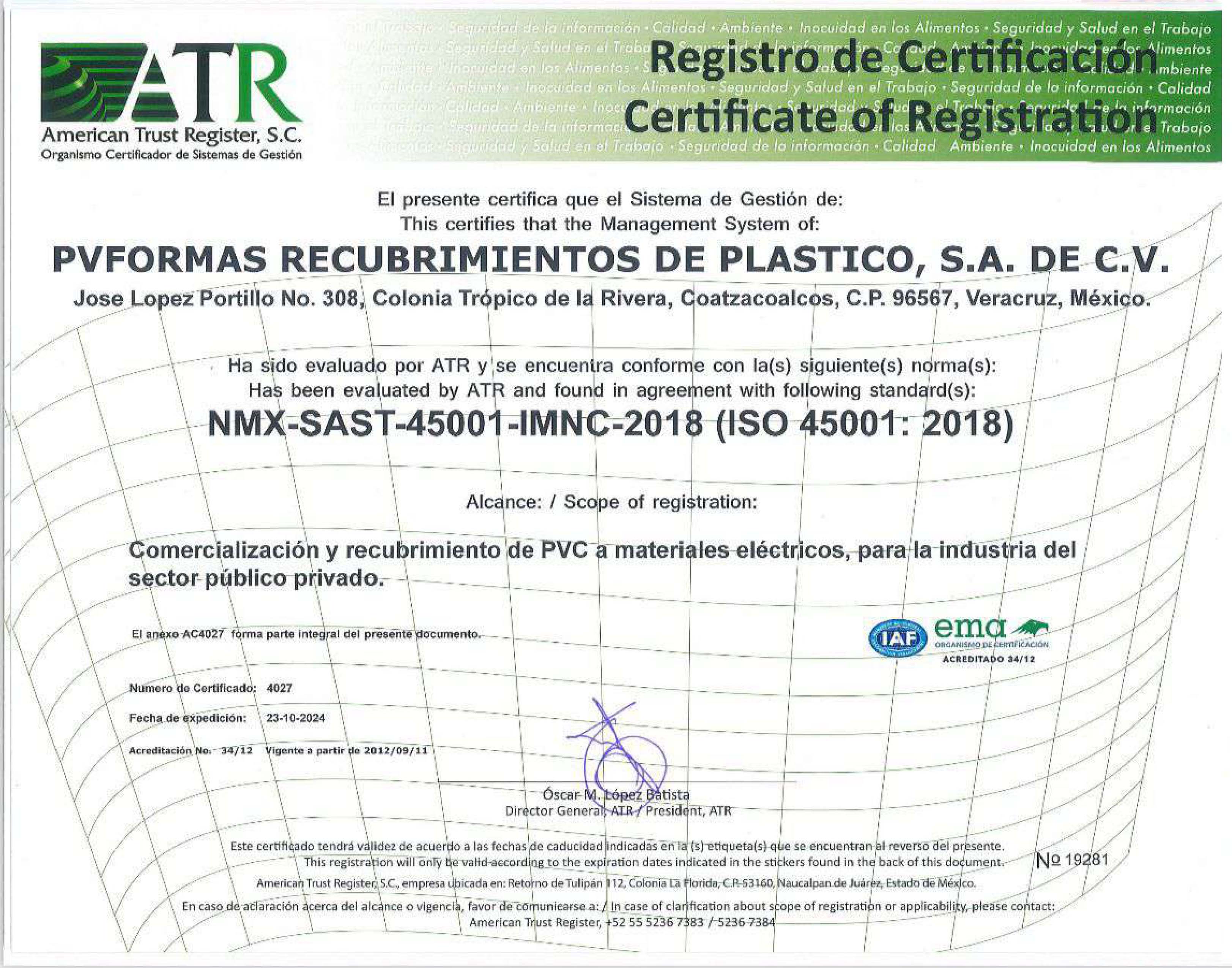 Sistema de Gestión de Calidad, Ambiental, Seguridad y Salud en el Trabajo Certificado por American Trust Register, S.C.