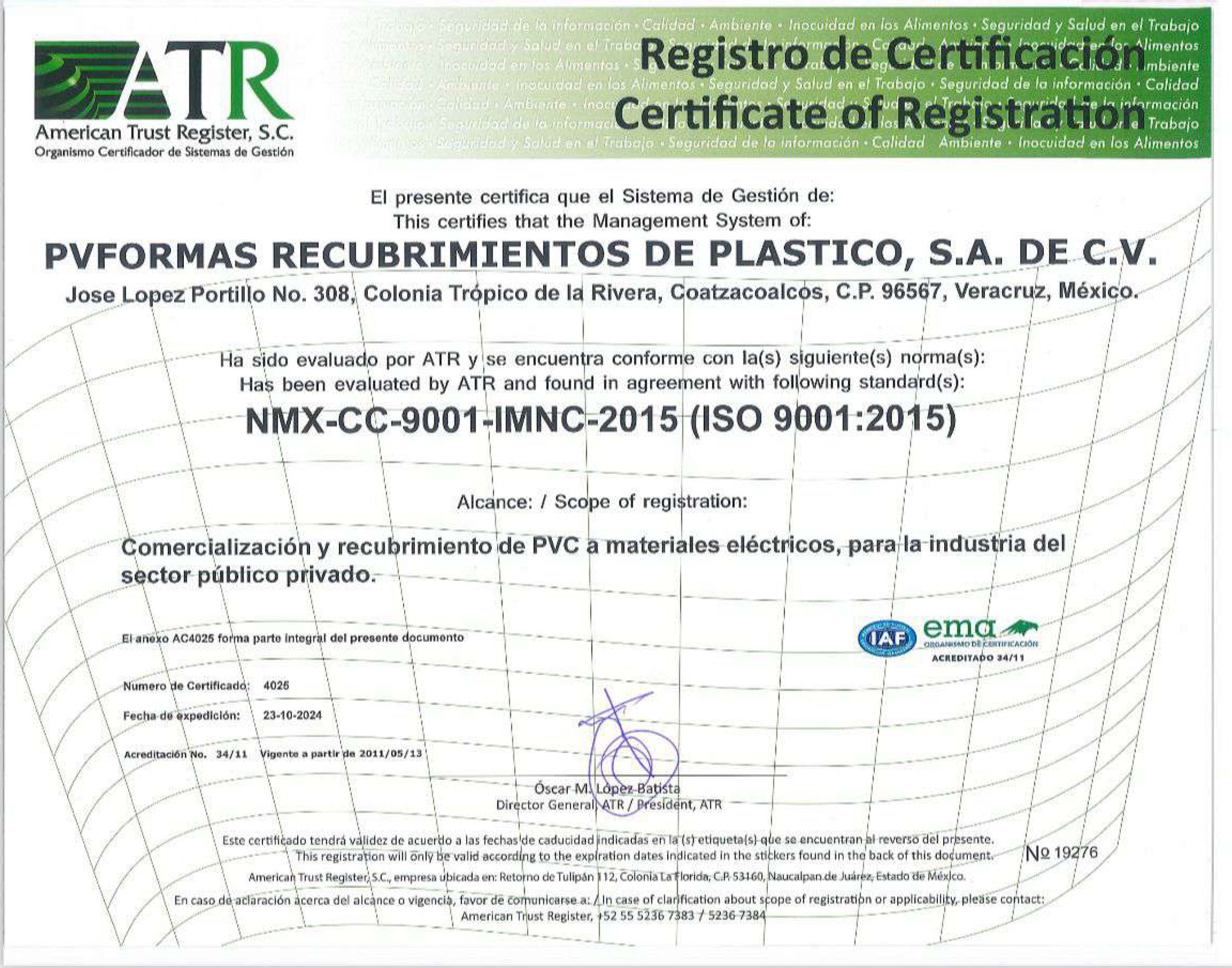 Alcance de Cenificación aplica a: Comercialización y recubrimiento de PVC a materiales eléctricos, para la industria del sector público privado".